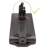 Det finns 2 versioner av detta batteri till Dyson V11. Vänligen jämför anslutningen från ditt eget batteri med anslutningen på bilderna ovan. Om ditt nuvarande batteri har en röd knapp är detta batteri från oss INTE rätt för dig. Du hittar den andra versionen under ”Relaterade produkter”.